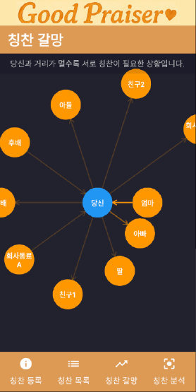 사람들은 말로는 서로 잘한다고 하지만, 실제로 언제, 누구와, 어떤 감정 교류를 했는지를 명확하게 기억하기는 어렵습니다. GoodPraiser는 당신을 중심에 두고, 당신과 감정을 나눈 사람들을 마치 별자리를 잇듯 보여줍니다. 누가 당신을 칭찬했는지, 당신이 누굴 칭찬했는지, 그리고 그 빈도와 방향성은 어떠한지 시각적으로 드러냅니다. 칭찬이 멈춘 시간도 중요하게 여깁니다. 서로 좋은 감정을 주고받았지만 시간이 흘러 그 연결이 멀어졌다면, 앱은 그 거리감을 보여줍니다. 단절된 감정의 흐름은 스스로를 돌아보는 계기가 되며, 다시 관계를 이어갈 수 있는 조용한 제안이 됩니다.