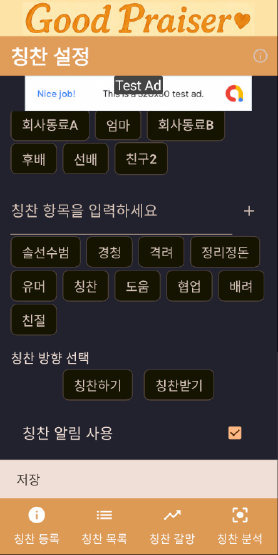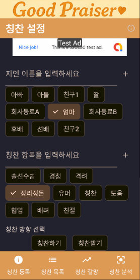 이 앱은 또한 당신 자신을 이해하는 통로가 됩니다. 당신이 주로 어떤 칭찬을 하는 사람인지, 사람들이 당신을 어떤 모습으로 기억하고 있는지를 모아볼 수 있습니다. 예를 들어, 당신이 사람들에게 '신뢰감 있다'는 칭찬을 자주 듣는다면, 그것은 단순한 인상 이상으로 당신의 인간적 가치를 보여주는 지표가 됩니다. 반대로, 당신이 주로 '성실함'이나 '센스'를 칭찬하는 사람이라면, 그 안에는 당신이 중요하게 여기는 삶의 기준이 숨어 있습니다. GoodPraiser는 그렇게 당신의 언어와 감정을 데이터로 바꾸는 것이 아니라, 당신의 태도와 시선을 시각화하여 삶을 바라보는 거울로 제시합니다.