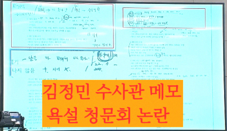국회 청문회에서는 또 다른 파문이 발생했습니다. 김정민 수사관이 작성한 답변 준비 메모에서 욕설이 담긴 문구가 확인된 것입니다. 해당 메모에는 “남들 다 폐기해, ㅂㅅ들아”라는 표현이 포함되어 있었으며, 이 외에도 “폐기 → 나 몰라!”, “지시 X”, “만약에” 등의 문구가 적혀 있었습니다. 이 문구는 증거물 관리나 보고 과정과 연관된 맥락으로 해석될 수 있어 논란을 불러왔습니다.